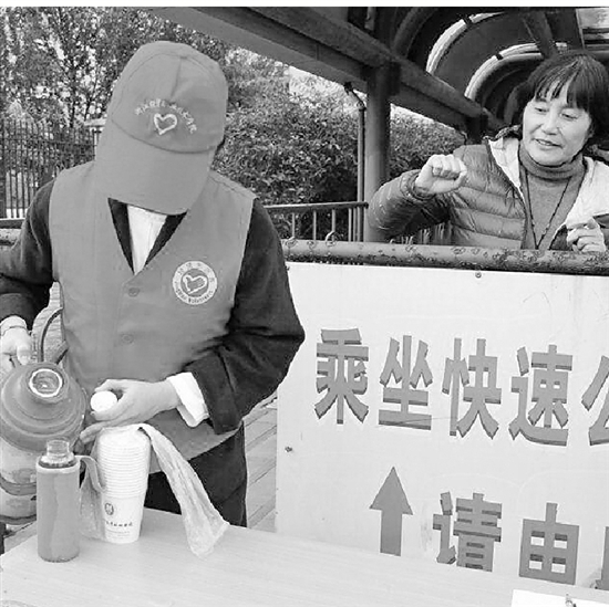 “我去公交车站服务那一天恰逢下雨,特别冷,我们给乘客送热水时,和他们说‘需要热水吗,可以暖和一下身体’,他们不仅接下了水,还很贴心地说‘你们在这里也站很久了,你们自己也喝一点,不要冻着了’。”志愿者倪香红说这件事让她特别感动。
