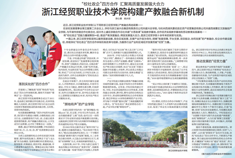 一直以来,浙江经贸学院坚持以服务国家战略、契合区域发展、支撑产业升级为导向,明确“制度保障、平台支撑、项目驱动、协同发展”的产教融合、校企合作建设路径,持续深化“校社政企”四方合作体制机制改革与创新,为服务行业产业和区域经济发展贡献“经贸”力量。