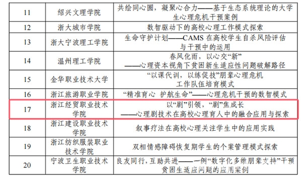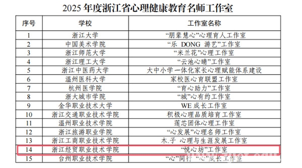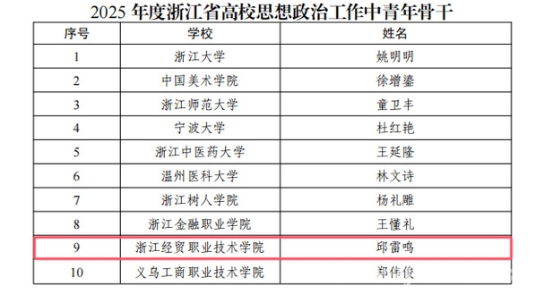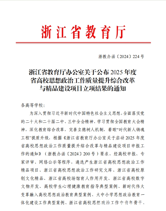 近日,浙江省教育厅公布了2025年度高校思想政治工作质量提升综合改革与精品建设项目立项结果,我校省高校思想政治工作中青年骨干、省高校学生心理健康教育指导典型案例、省心理健康教育名师工作室等3个项目入选。